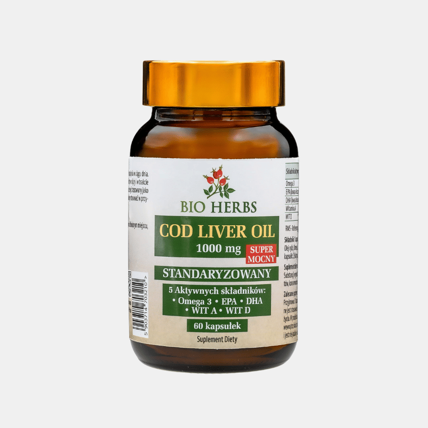 Olej z Wątroby Dorsza COD LIVER OIL to super mocny, standaryzowany olej z wątroby dorsza w wygodnej formie 60 kapsułek (1003,5 mg / kaps.). Jedna kapsułka dostarcza 290 mg Omega‑3 (w tym 99 mg EPA i 118 mg DHA) oraz istotne ilości witaminy A i D, dzięki czemu produkt kompleksowo wspiera zdrowie serca, układ nerwowy, odporność oraz mineralizację kości i zębów.