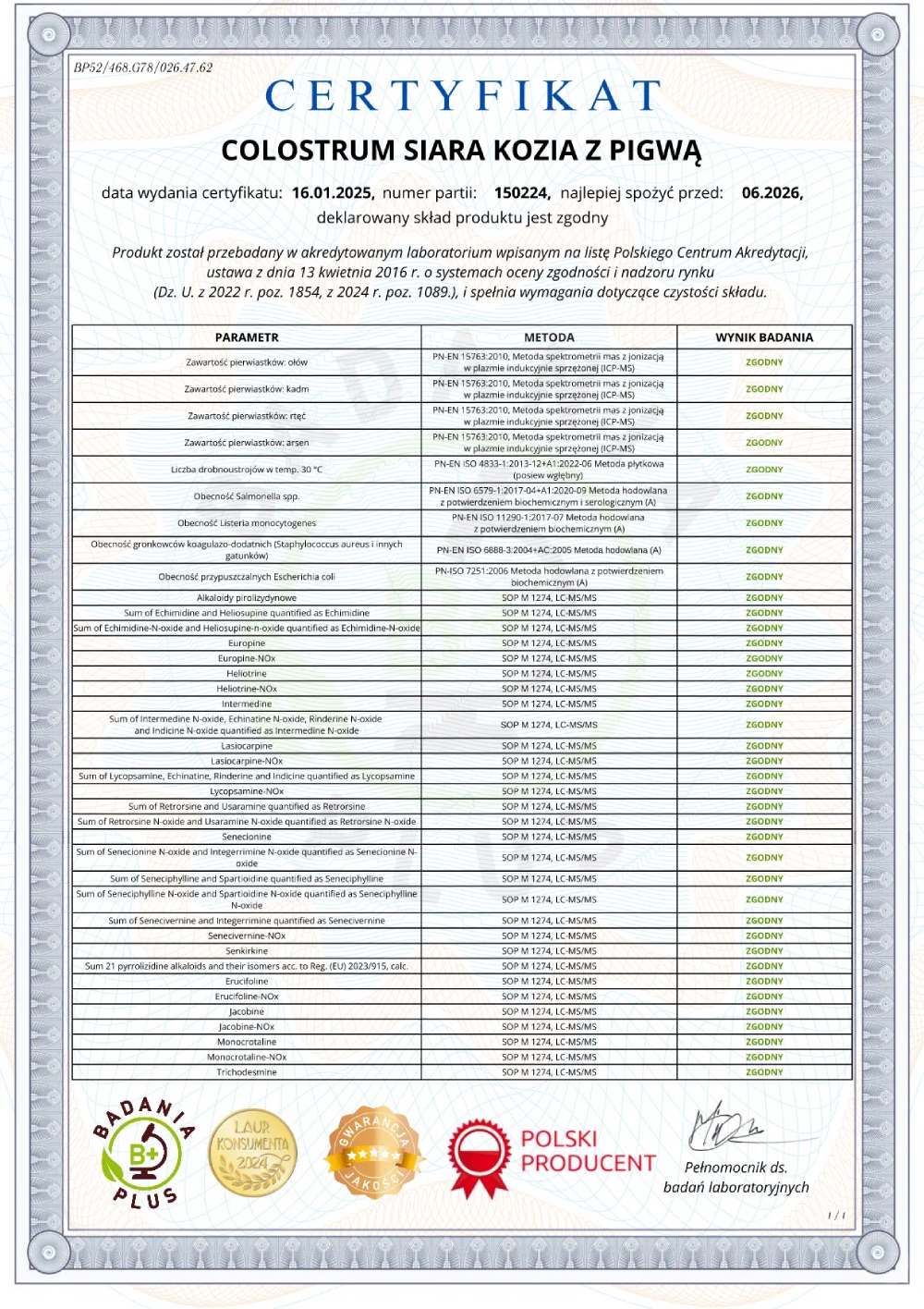 Colostrum Kozie Skoczylas z pigwą posiada certyfikat zgodności i czystości produktu „Badania Plus”. “Badania plus” to znak, który informuje, że produkt został przebadany laboratoryjnie(tylko i wyłącznie w laboratoriach akredytowanych) oraz spełnia wymogi czystości składu i zawartości. W ręce klientów trafiają tylko produkty, których wyniki są w 100% pozytywne.